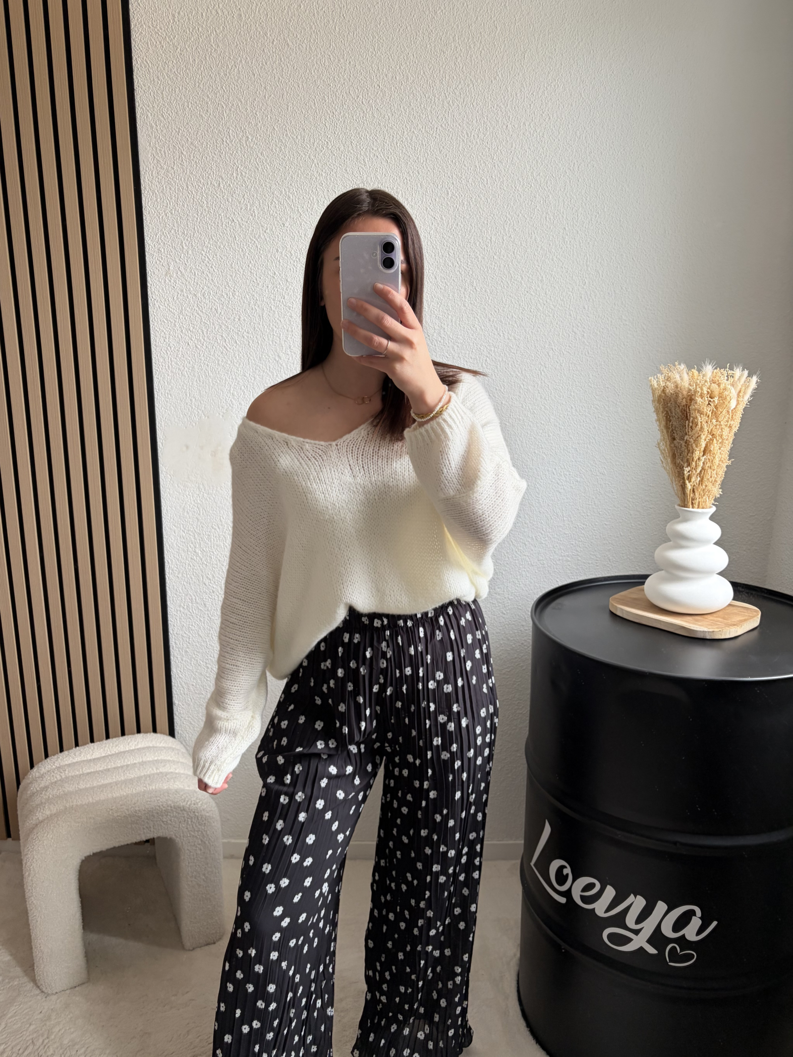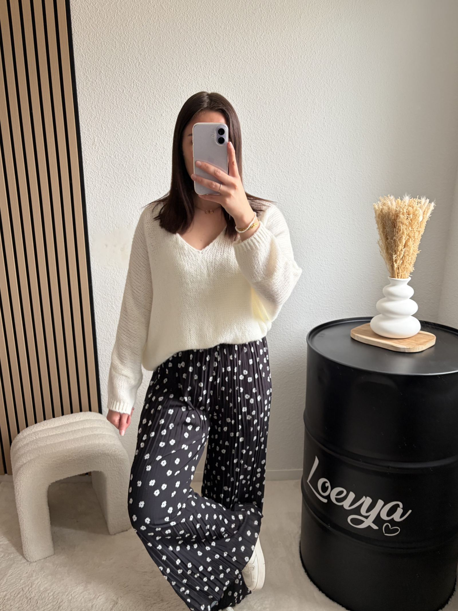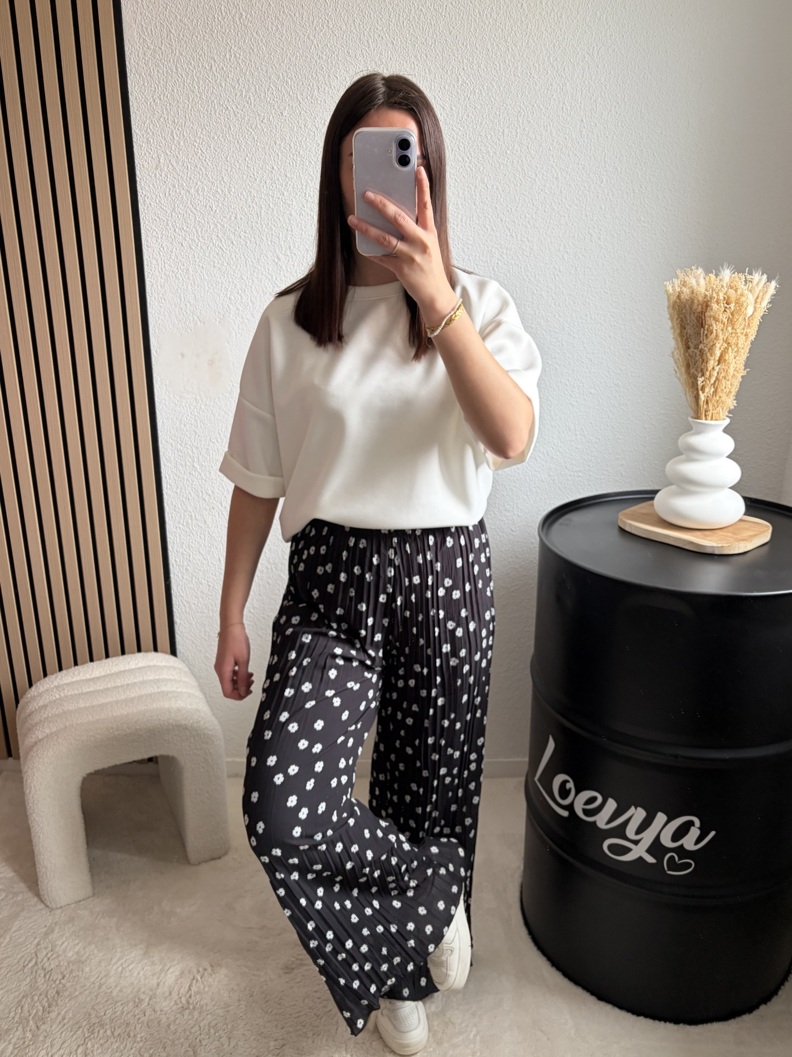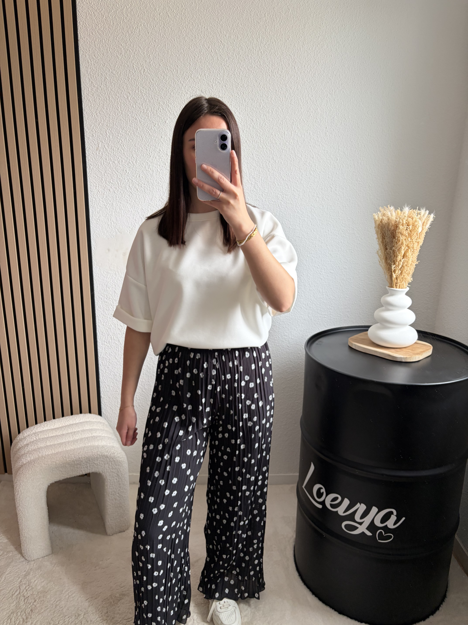 Découvrez le Pantalon Plissé Fleurs, une pièce chic et féminine qui apporte légèreté et élégance à vos tenues. Sa coupe fluide et ses plis raffinés offrent un tombé élégant et confortable, tandis que son imprimé floral blanc sur fond noir apporte une touche délicate et tendance. Doublé pour plus de confort et d’opacité, il se porte facilement du quotidien aux occasions plus habillées.