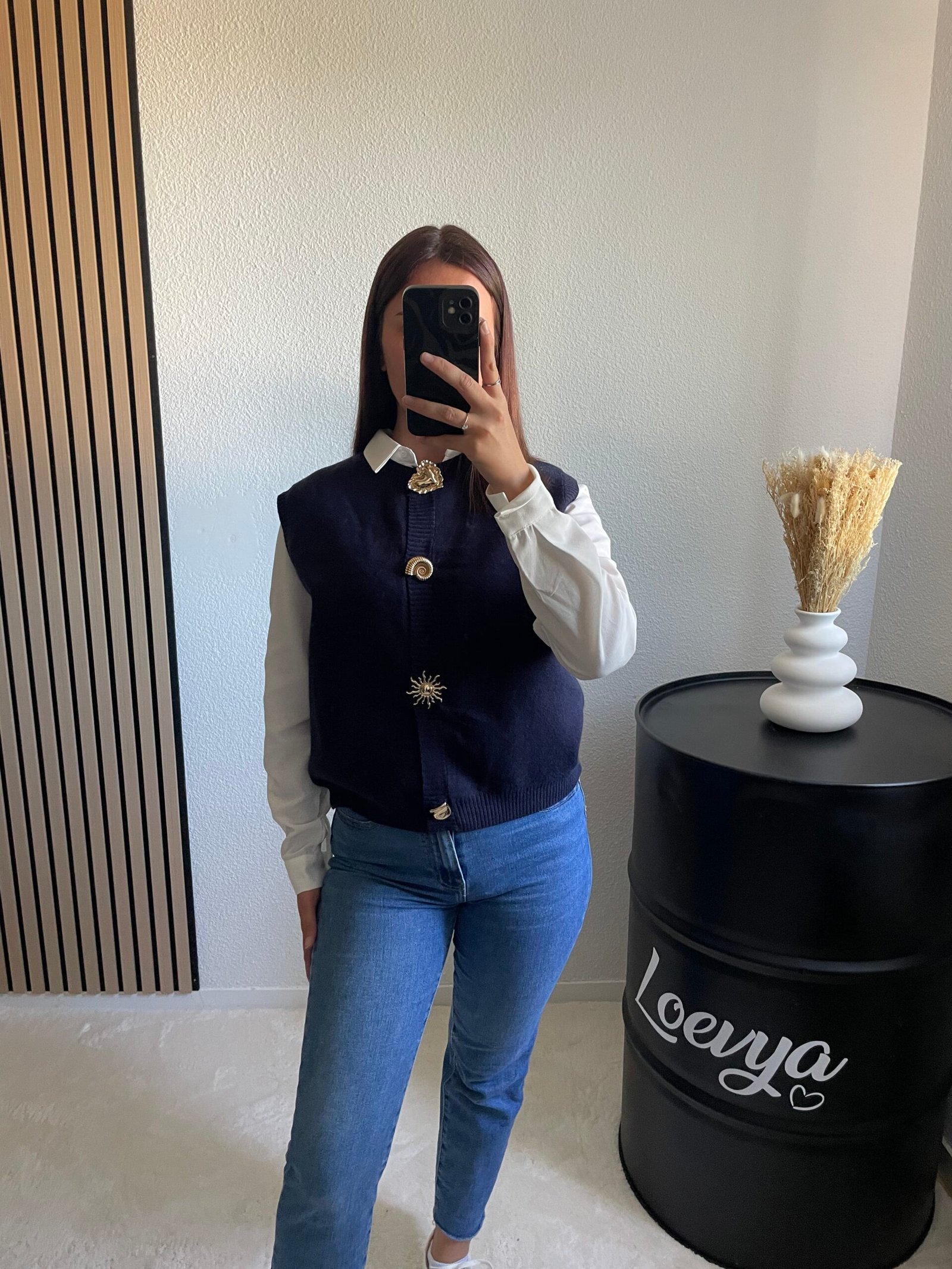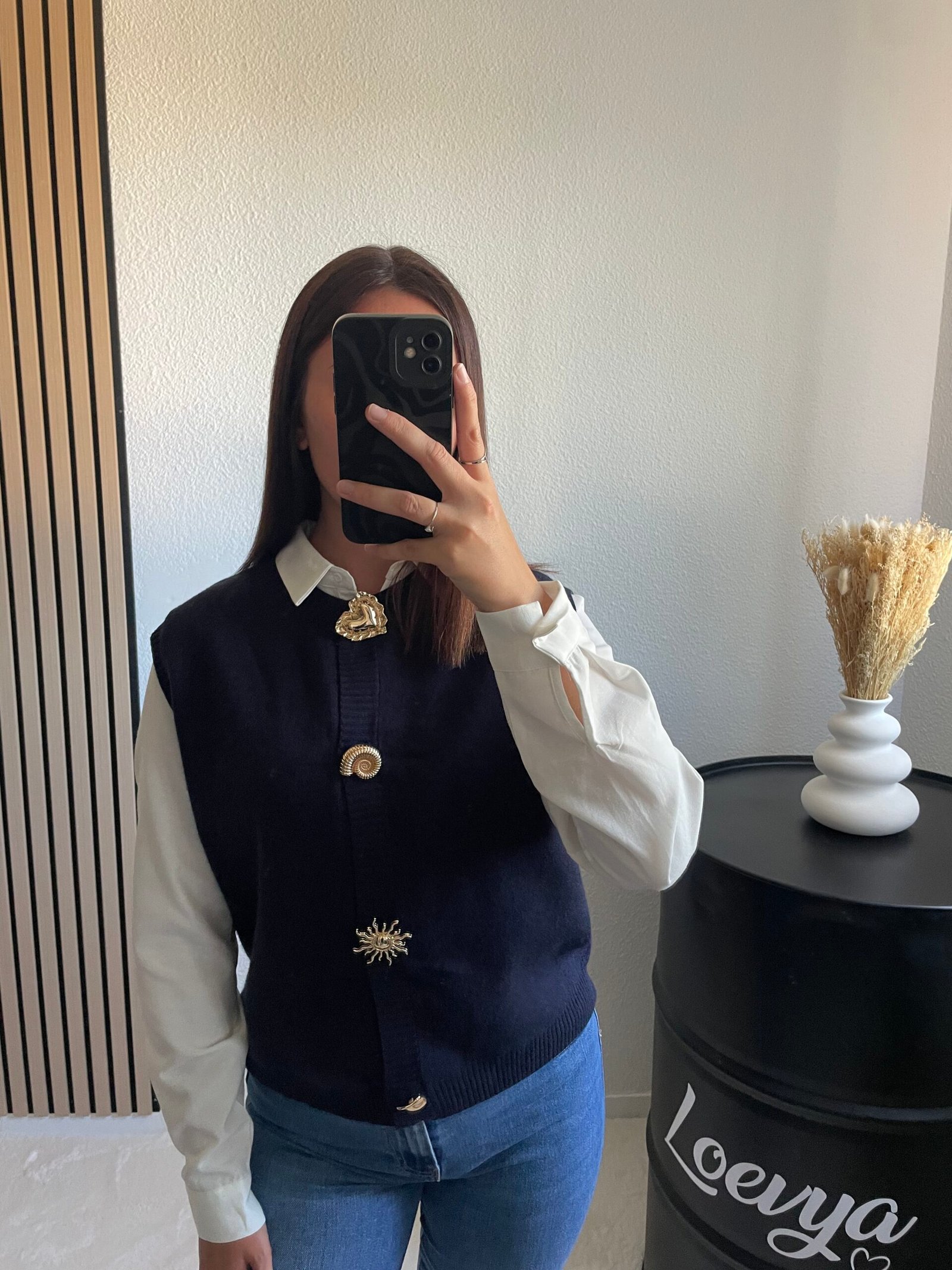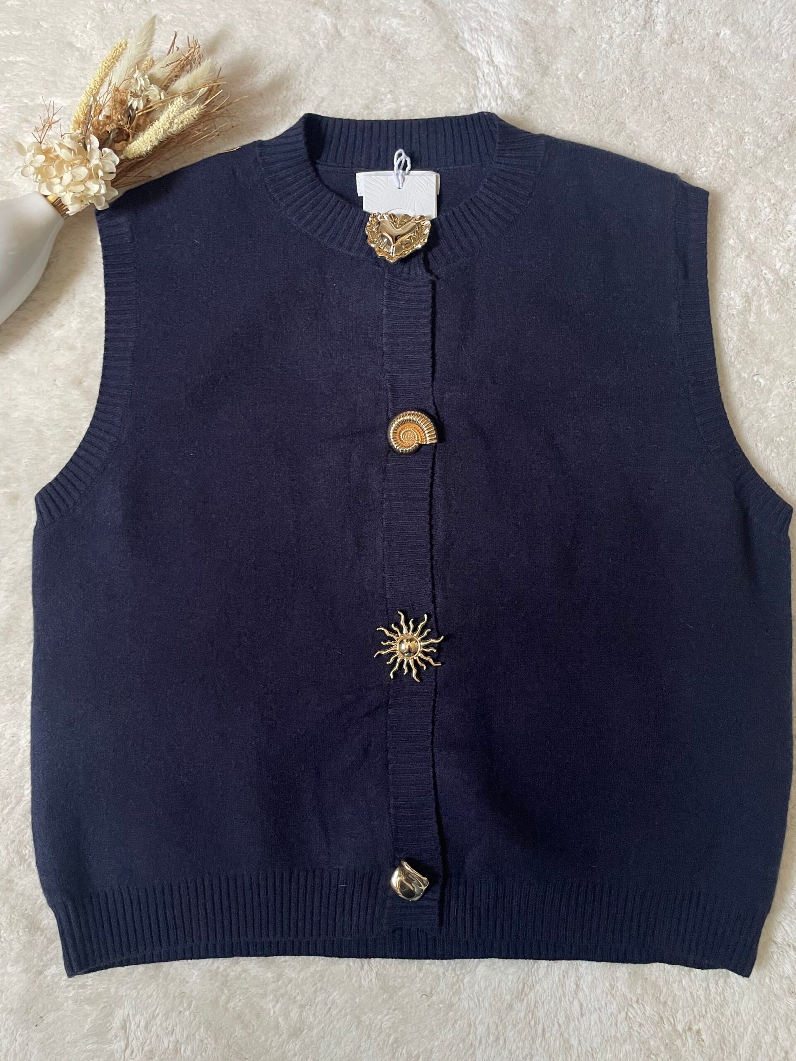 Découvrez le Pull sans manches Oriane, un modèle bleu marine ultra-doux et confortable. Ses boutons dorés tendance, représentant un coquillage, un soleil, un cœur et un carré, apportent une touche originale et raffinée à vos tenues.